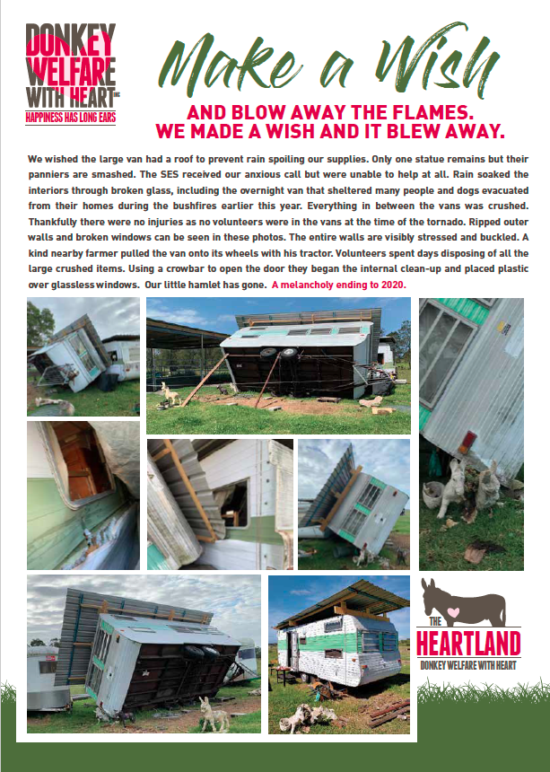 We wished the large van had a roof to prevent rain spoiling our supplies. Only one statue remains but their panniers are smashed. The SES received our anxious call but were unable to help at all. Rain soaked the interiors through broken glass, including the overnight van that sheltered many people and dogs evacuated from … Continue reading A melancholy ending to 2020